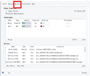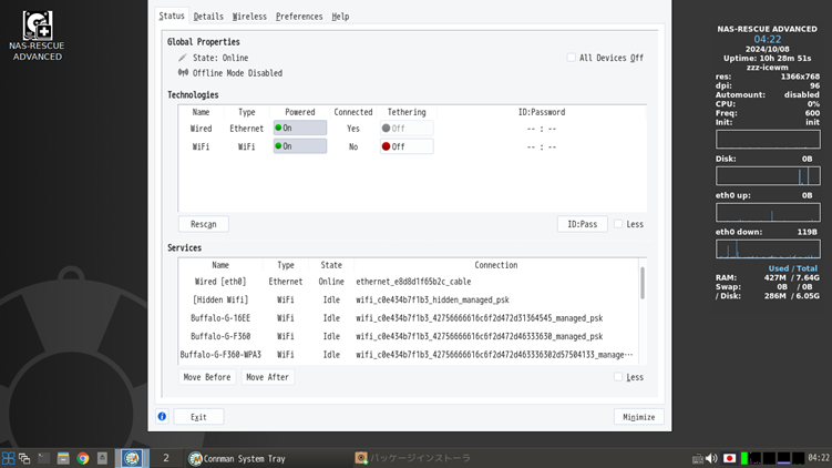 ADVANCEDを起動すると、PCにWifi機能が有って、AntiXで認識されると、LAN接続のステータス・ウィンドウが表示されます。