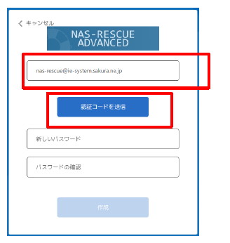 「認証コード送信」画面が表示されるので、ユーザー登録するメールアドレスを入力し、「認証コード送信」ボタンをクリックします。