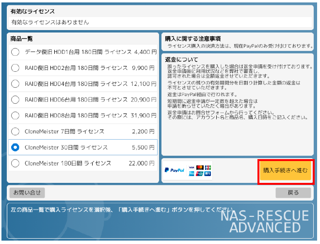 購入するライセンスにチェックを入れて、「購入手続きへ進む」ボタンをクリックします。PAYPAL決済の画面に進みます。