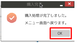 購入処理が完了しました。のメッセージが表示されるので、「OK」をクリックします。