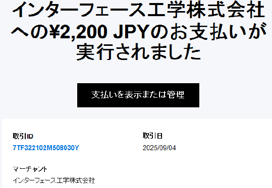 PAYPALでの手続きが終了すると、最終画面が表示されるので、「購入確定」ボタンをクリックします。ここで、「購入キャンセル」ボタンをクリックすると、購入がキャンセルされます。