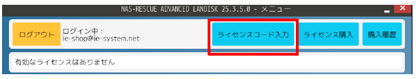 ADVANCEDのメニュー画面の上部の「ライセンスコード入力」をクリックし、ライセンスコードを入力します。