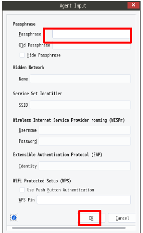 「Passphrase」に、ルーターのパスワードを入力して、「OK」をクリックします。