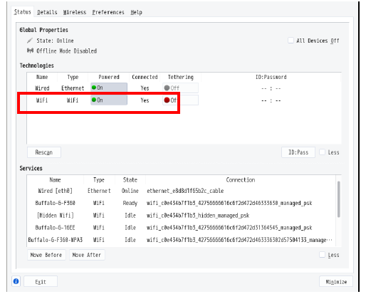 LAN接続ステータス・ウィンドの、「Wifi」のConnectが、YESになります。